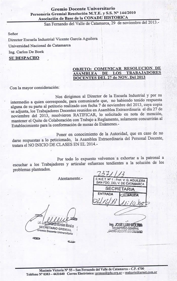 Comunicación sobre Asamblea Docente de la Escuela Industrial del día 27 de Noviembre